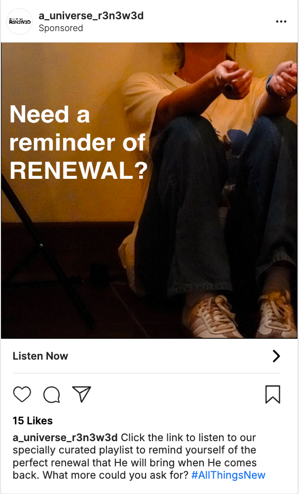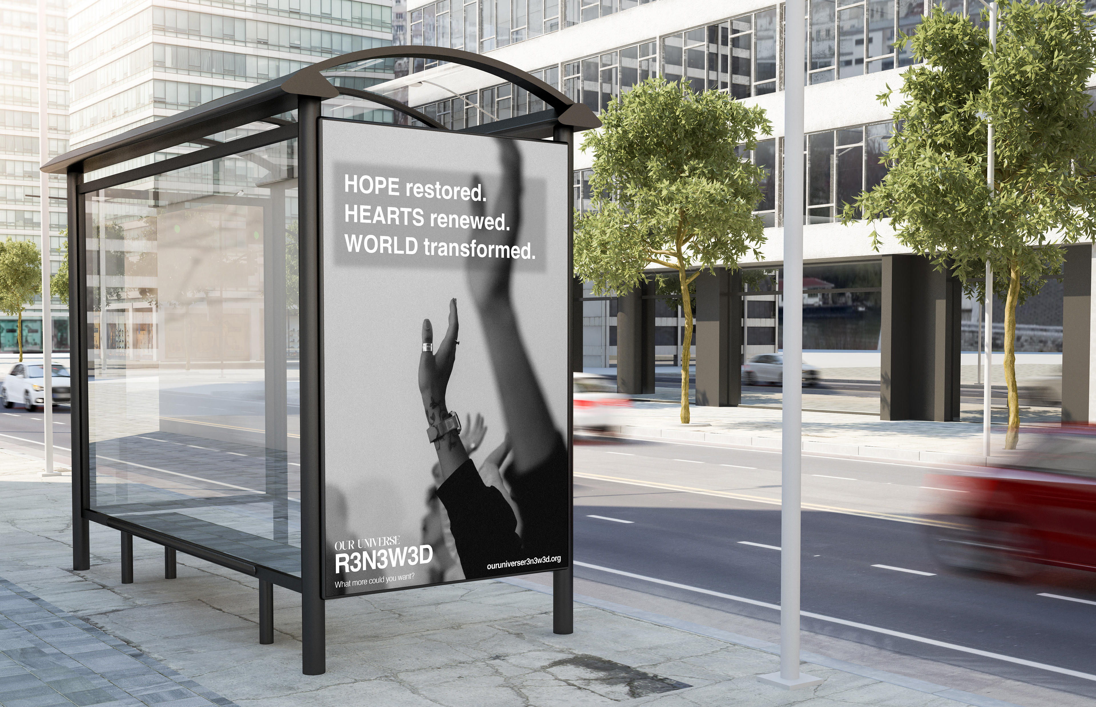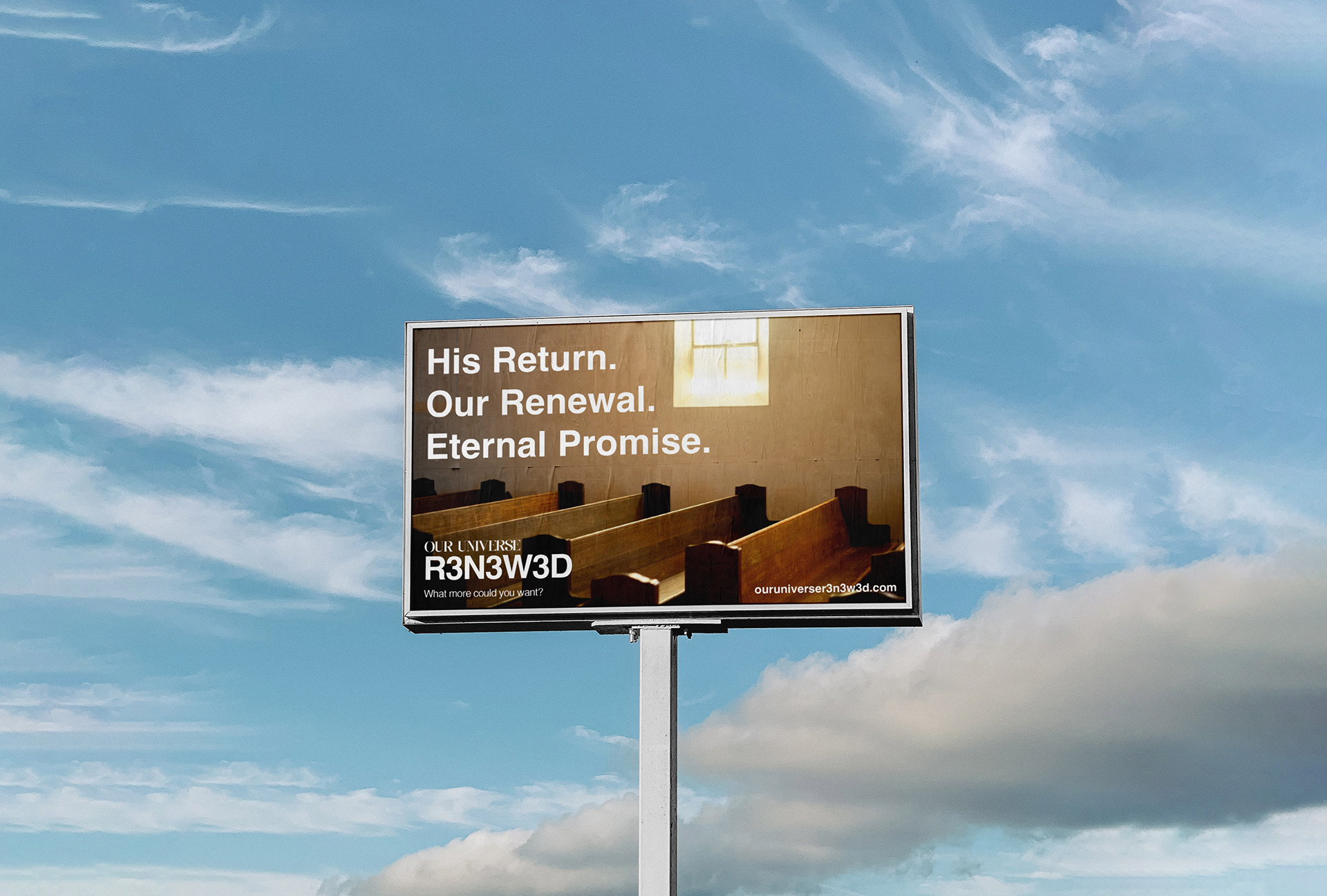 Our Universe R3N3W3D is a PSA campaign, sharing the news of the Second Coming of Jesus. This integrated campaign is targeted towards Generation Z, by using bold copy, simple photography, and a simple typeface.